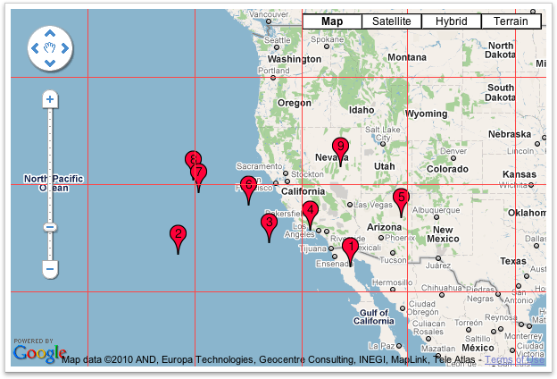 This technique can be rather quick because it only requires iterating through the markers once to see if its position is between a set of coordinates; no complicated distance calculation is needed. It does have some limitations, as you can see marker's 7 and 8 are close together but because they are in separate grids they are not clustered together.